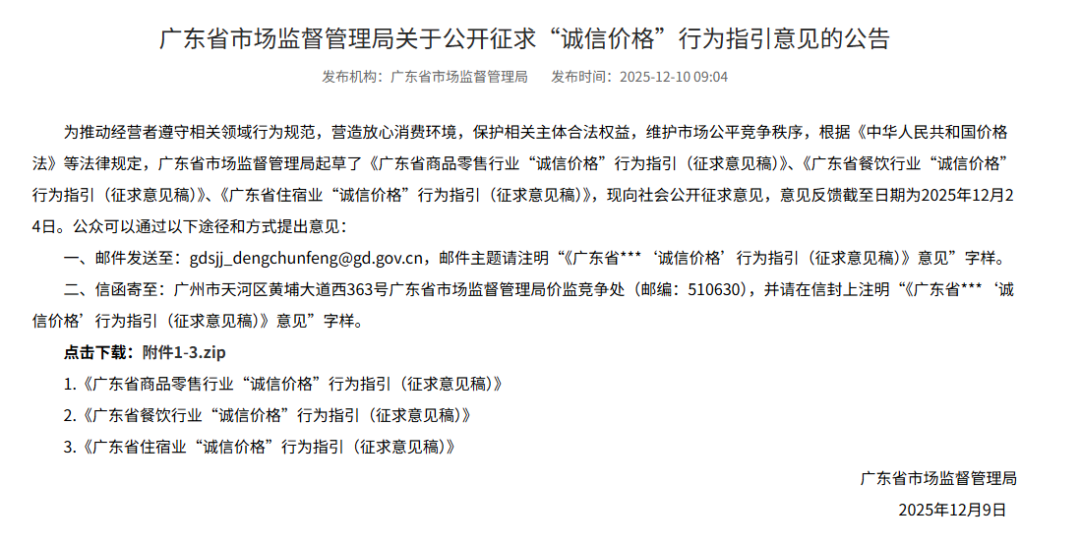 日前,《广东省商品零售行业“诚信价格”行为指引(征求意见稿)》《广东省餐饮行业“诚信价格”行为指引(征求意见稿)》《广东省住宿业“诚信价格”行为指引(征求意见稿)》3份意见稿向社会公开征求意见,意见反馈截止日期为2025年12月24日。